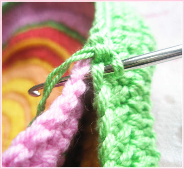 Зелёную полоску (боковую вставку) я связала отдельно. Длина равна количеству петелек по краю круга(у меня 94), ширина примерно 2см(у меня два ряда ССН)