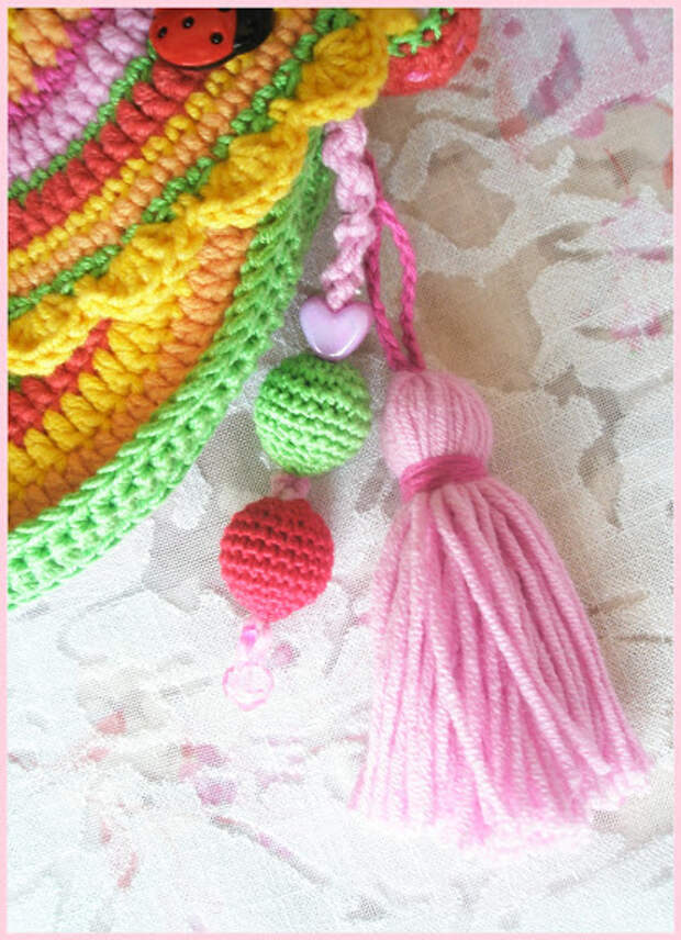 Яркая летняя сумочка для девушки-подростка! Аксессуар идеально подойдёт к джинсовой одежде. Связана из 100%хлопка CHARM крючком №2,5. Украшения — съёмные, на карабинчиках. Длина ручки 130см, диаметр сумочки 25см.