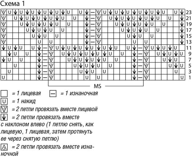 Число петель кратно 16 + 15 + 2 кромочные = вязать согл. схеме 1. На ней даны лицевые ряды. В изнаночных рядах все петли провязывать по рисунку, накиды провязывать изнаночными.Начать с 1 кромочной и петель перед раппортом, раппорт постоянно повторять, закончить петлями после раппорта и 1 кромочной. Постоянно повторять 1–24-й ряды.