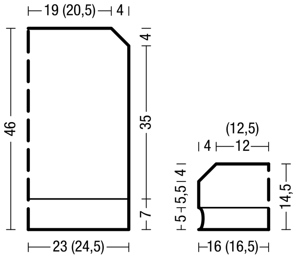22 п. х 28 р. = 10 х 10 см, связано лицевой гладью спицами №4,5.ВЫКРОЙКА