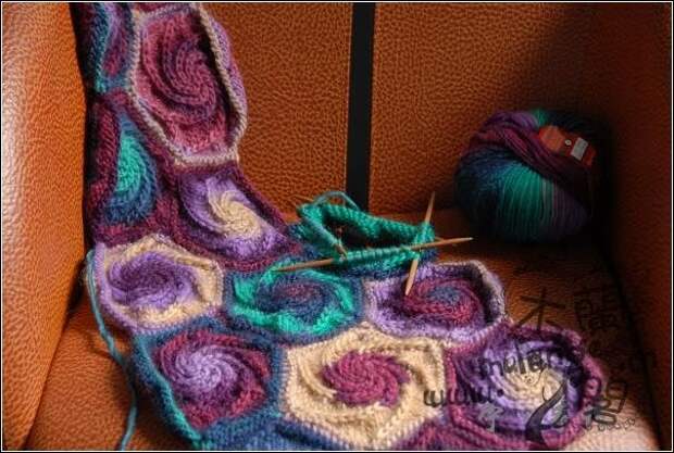 Очень интересный мотив. описание слегка кривенькое, но надеюсь, принцип уловите. Одно не пойму, написано набрать на три спицы, а на фото их первоначально явно четыре. Короче оставляю описание в первозданном виде, кто возьмется попробовать, делитесь комментариями, буду поправлять описание, если что не так. (С.З.)