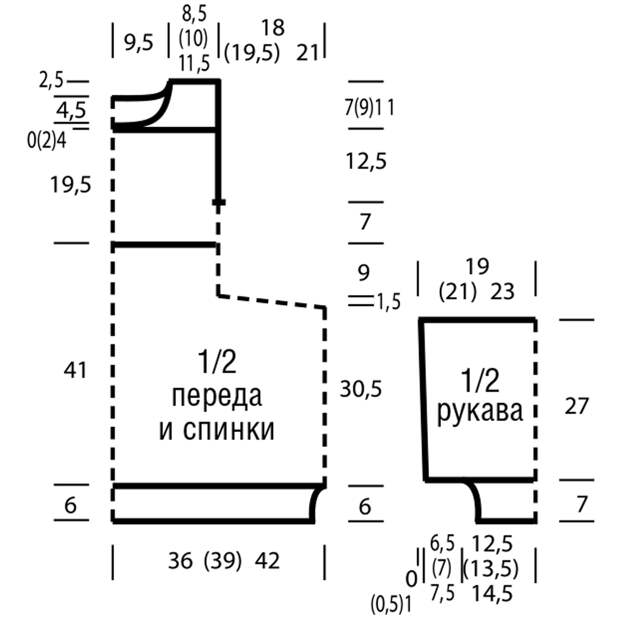 Спинку и перед до пройм вязать единым полотном круговыми рядами. Затем закончить детали раздельно.ВЫКРОЙКА